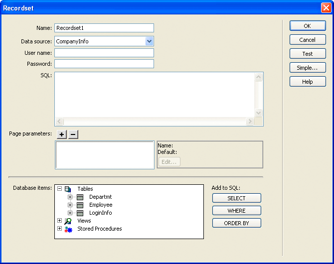 The following figure shows an advanced Recordset dialog box that uses a database tree control and a variable grid control: