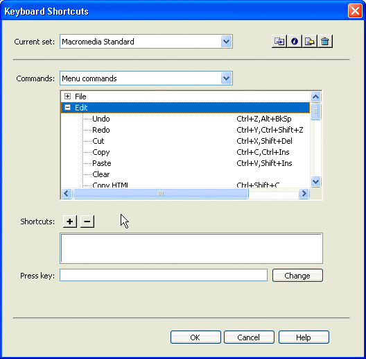 Tree controls display data in a hierarchical format and let users expand and collapse nodes in the tree. The MM:TREECONTROL tag lets you create tree controls for any type of information. Unlike the database tree control that is described in Adding a database tree control, no association with a database is required. The Dreamweaver Keyboard Shortcuts editor uses the tree control, as shown in the following figure: