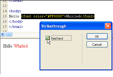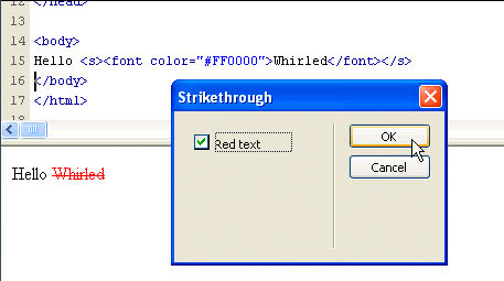 You can add a form to your object to let the user enter parameters before Dreamweaver inserts the specified code (for example, the Hyperlink object requests the text, link, target, category index, title, and access key values from the user). In this example, you add a form to the Strikethrough object from the previous example. The form opens a dialog box that provides the user with the option to change the text color to red as well as to add the strike-through tag.