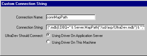 - MapPath Connection String: "Provider=Microsoft.Jet.OLEDB.4.0;Data Source=" & Server.MapPath("/ud/asp/UltraDev.mdb")