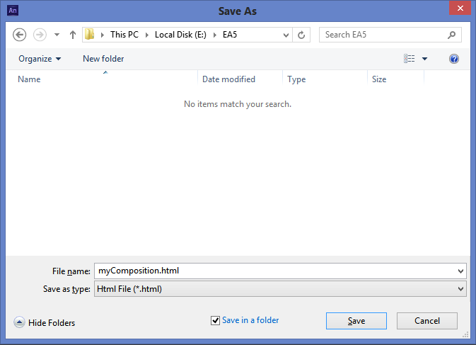 In this release of Edge Animate, the Save As dialog box includes a new option, Save In A Folder, which is selected by default for unsaved compositions. So, by default your compositions are now saved in a separate folder with the name of the composition, along with the related files and assets.