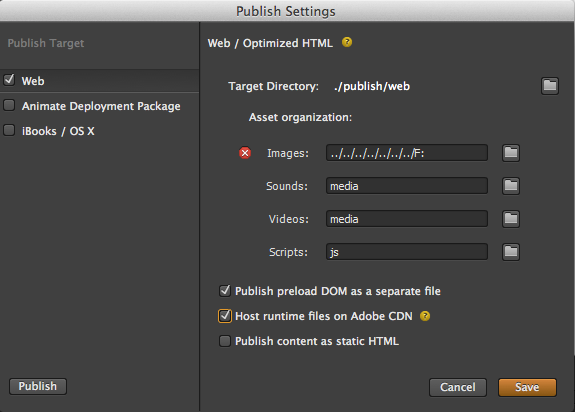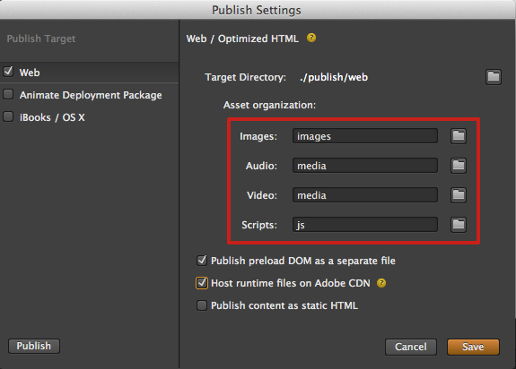 Edge Animate now lets you specify additional file paths to enable you to target required folders for each type of asset while publishing your compositions to Web. Since you can specify a relative path for your assets now, you can share your assets across multiple compositions easily.