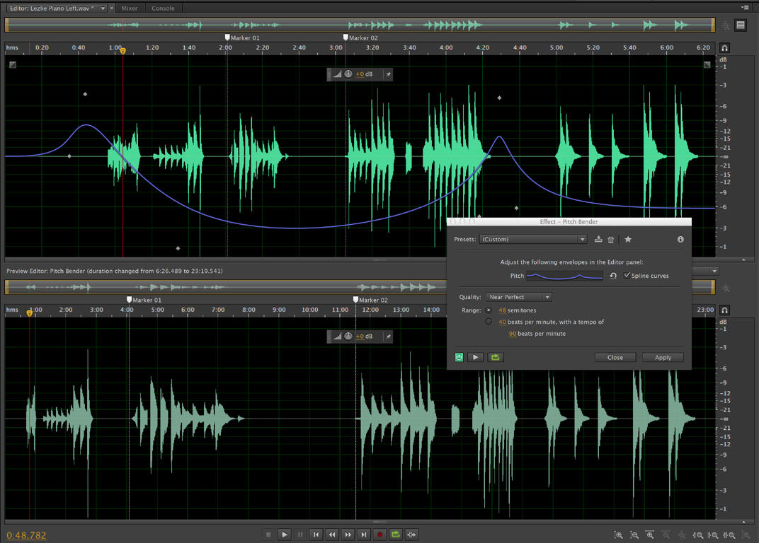 Use the Pitch Bender effect to change the tempo over time to vary the pitch. The effect now uses a keyframe edit envelope laid across the entire waveform, similar to the Fade and Gain Envelope effects.