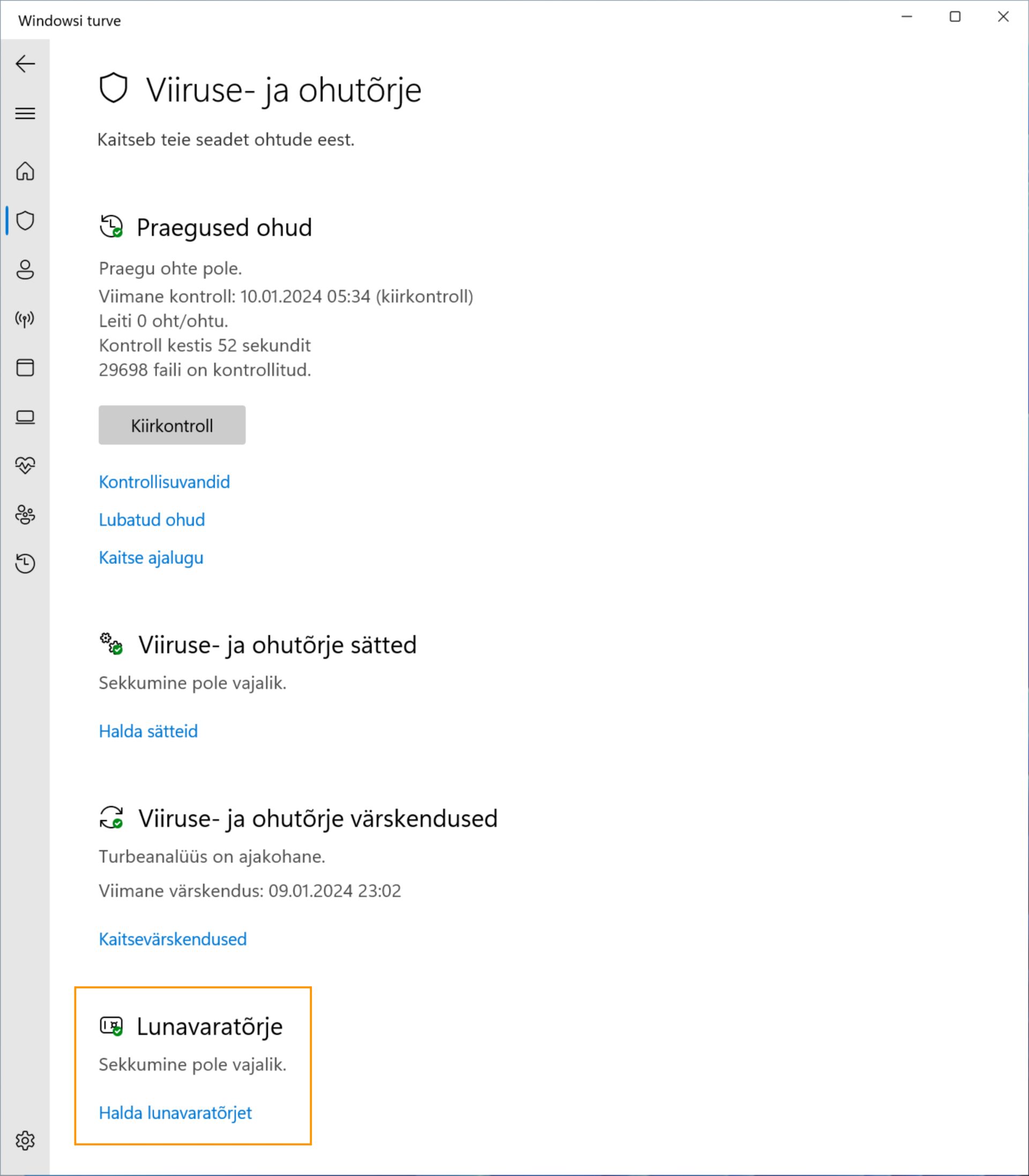 Viiruse- ja ohutõrje sätete alt valige Lunavaratõrje.