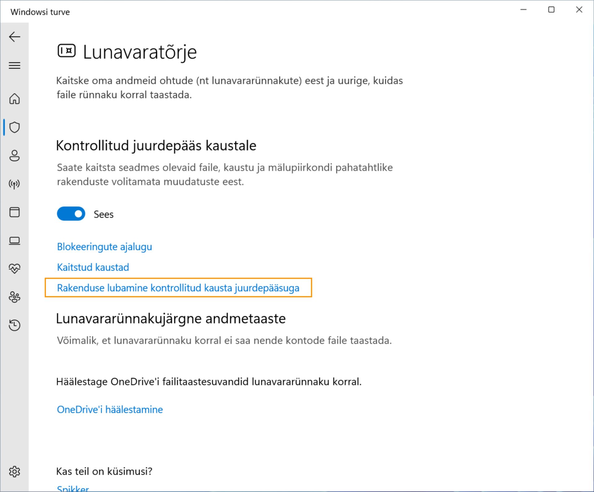 Valige Rakenduse lubamine kontrollitud kausta juurdepääsuga.