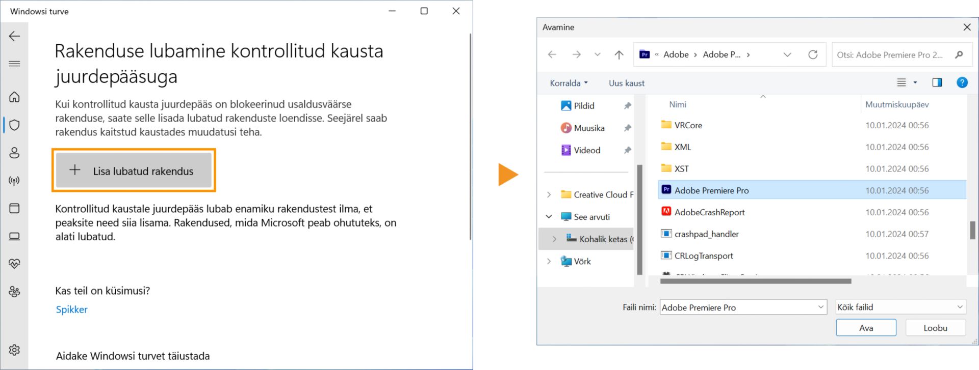 Premiere Pro, Adobe Media Encoderi või After Effectsi käivitamiseks, kui Kontrollitud juurdepääs kaustale on lubatud, toimige järgmiselt: