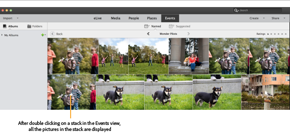 In the Event view, click the Named tab. The Named tab displays your files organized by events. Elements Organizer creates an event stack with the photos you selected in the previous section.