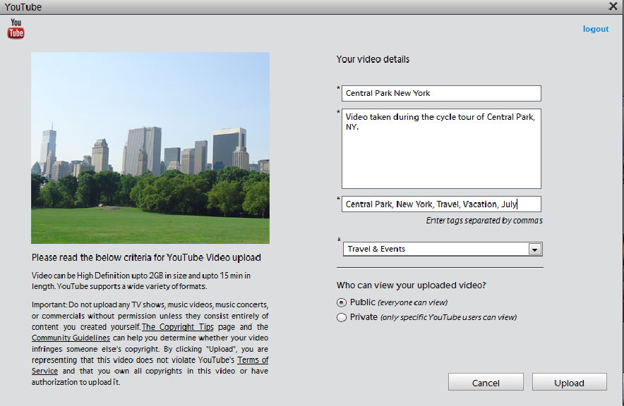 4. In the YouTube dialog, enter the following information, and click Upload after you are done. The information that you enter ensures that users can easily locate your video when searching for it.