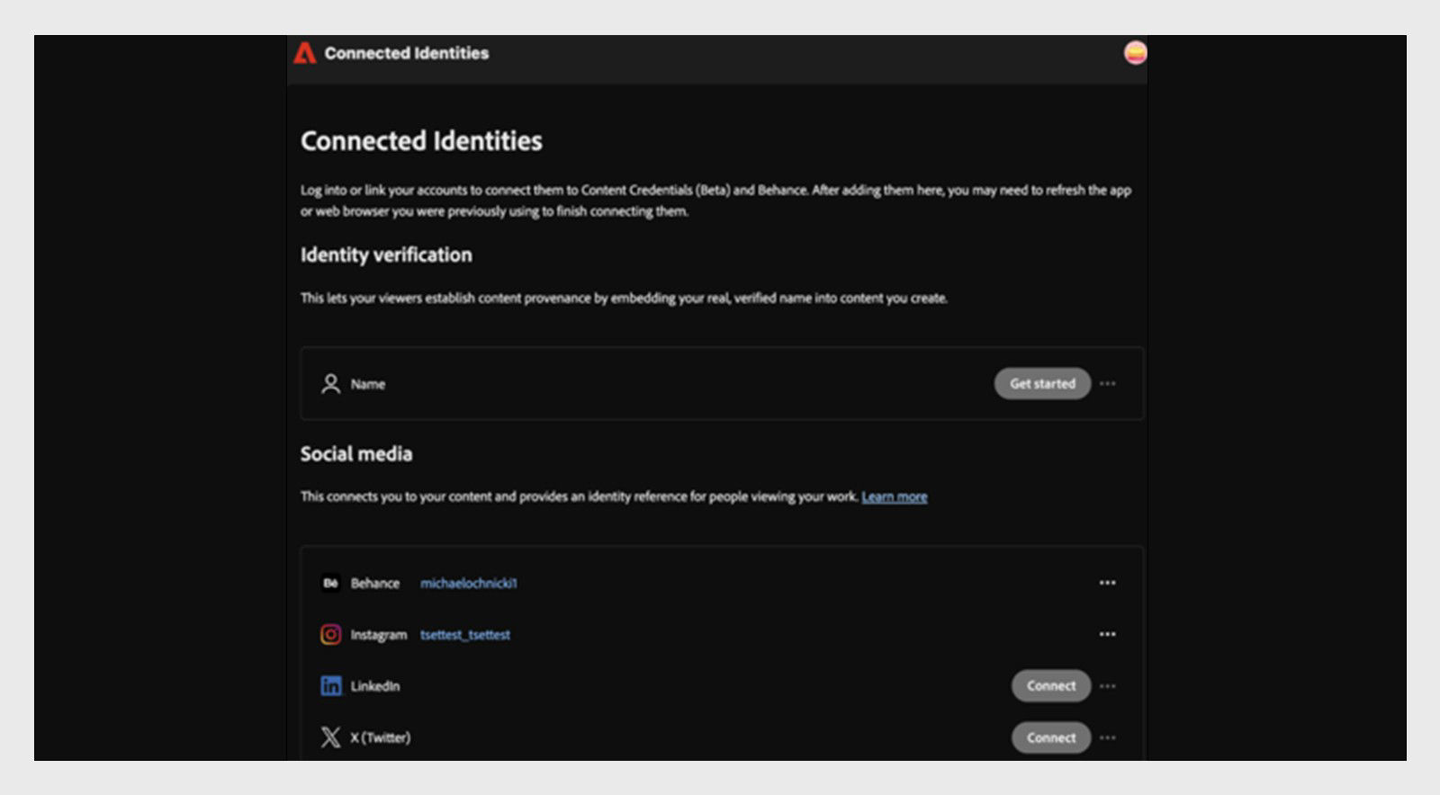 Manage access to the Connected Identities page, where users link external accounts and verified information for Behance and Content Credentials.