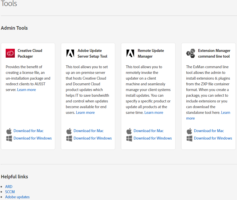 Download the Creative Cloud Packager, Adobe Extension Manager command-line tool, Adobe Update Server Setup Tool, or Remote Update Manager.