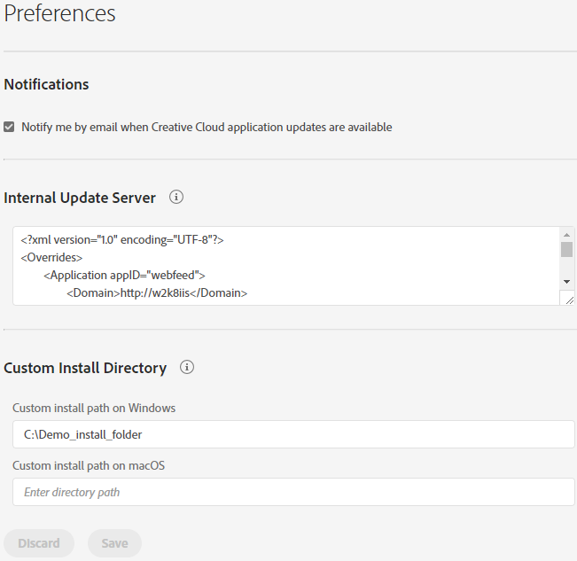 To configure an internal update server, download Adobe Update Server Setup Tool from the Tools section. Next, generate the override file, and paste its contents in the Internal Update Server box.