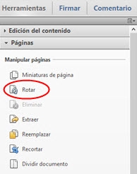 Puede rotar las páginas de un documento (todas o sólo las seleccionadas). La rotación se basa en incrementos de 90°. Puede rotar las páginas con las herramientas de rotación del panel Miniaturas de páginas o con la opción Rotar (que se describe a continuación).