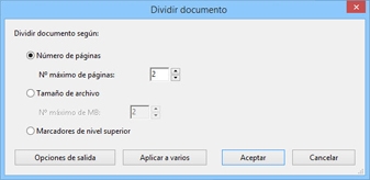 Puede dividir uno o varios documentos en documentos más pequeños. Al dividir un documento, puede especificar la división según el número máximo de páginas, el tamaño de archivo máximo o los marcadores de nivel superior.