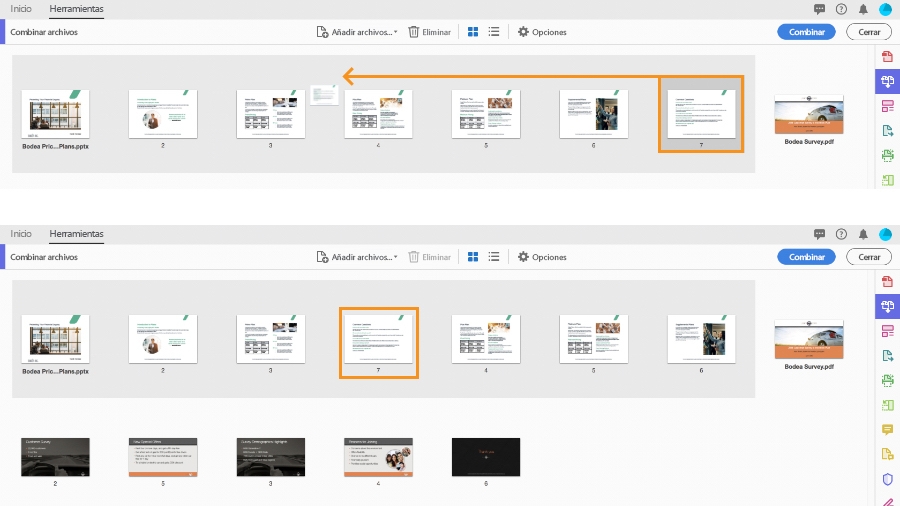 Si lo deseas, puedes reorganizar páginas individuales en un documento o alrededor de otros documentos desde el cuadro de diálogo Combinar archivos.