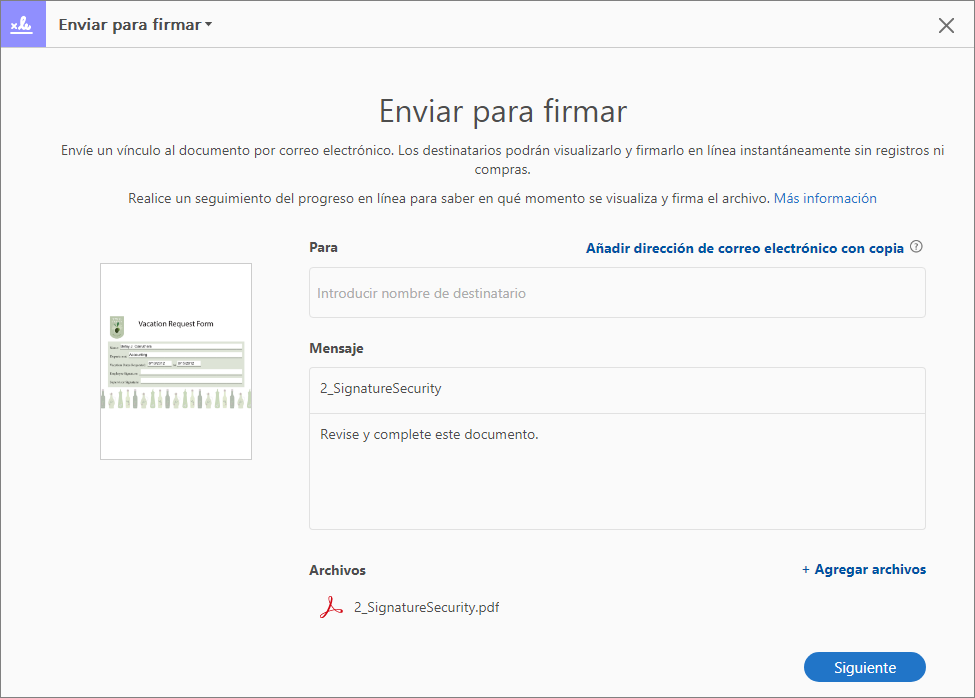 Para obtener más información, consulte Enviar documentos PDF para su firma.