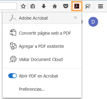 El complemento Crear PDF para Firefox se ha migrado al nuevo modelo basado en la extensión web que exige Firefox. En cuanto a la experiencia y el funcionamiento, el complemento actualizado es similar a la extensión de Chrome existente y es compatible con las siguientes opciones: Convertir página web a PDF, Agregar a PDF existente y Abrir PDF en Acrobat desde Firefox.