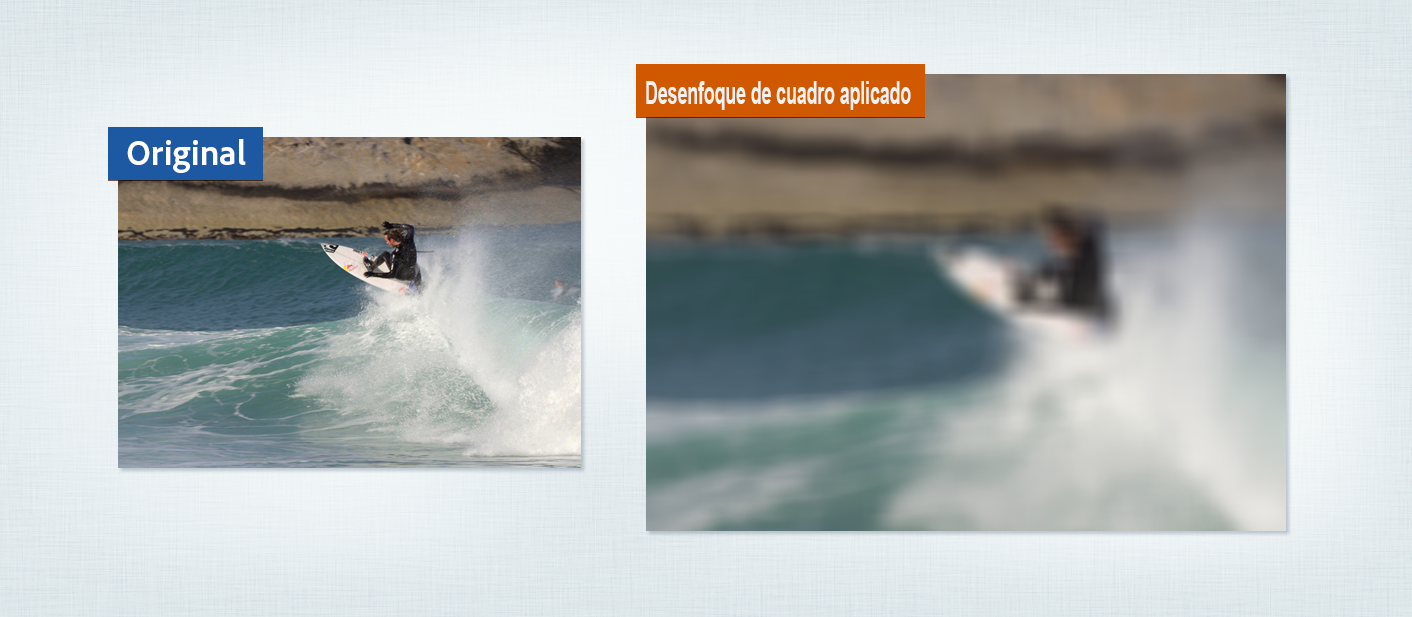 El Desenfoque de cuadro es parecido a los efectos Desenfoque rápido y Desenfoque gaussiano, pero el Desenfoque de cuadro tiene la ventaja de contar con la propiedad Iteraciones, que permite controlar la calidad del desenfoque.