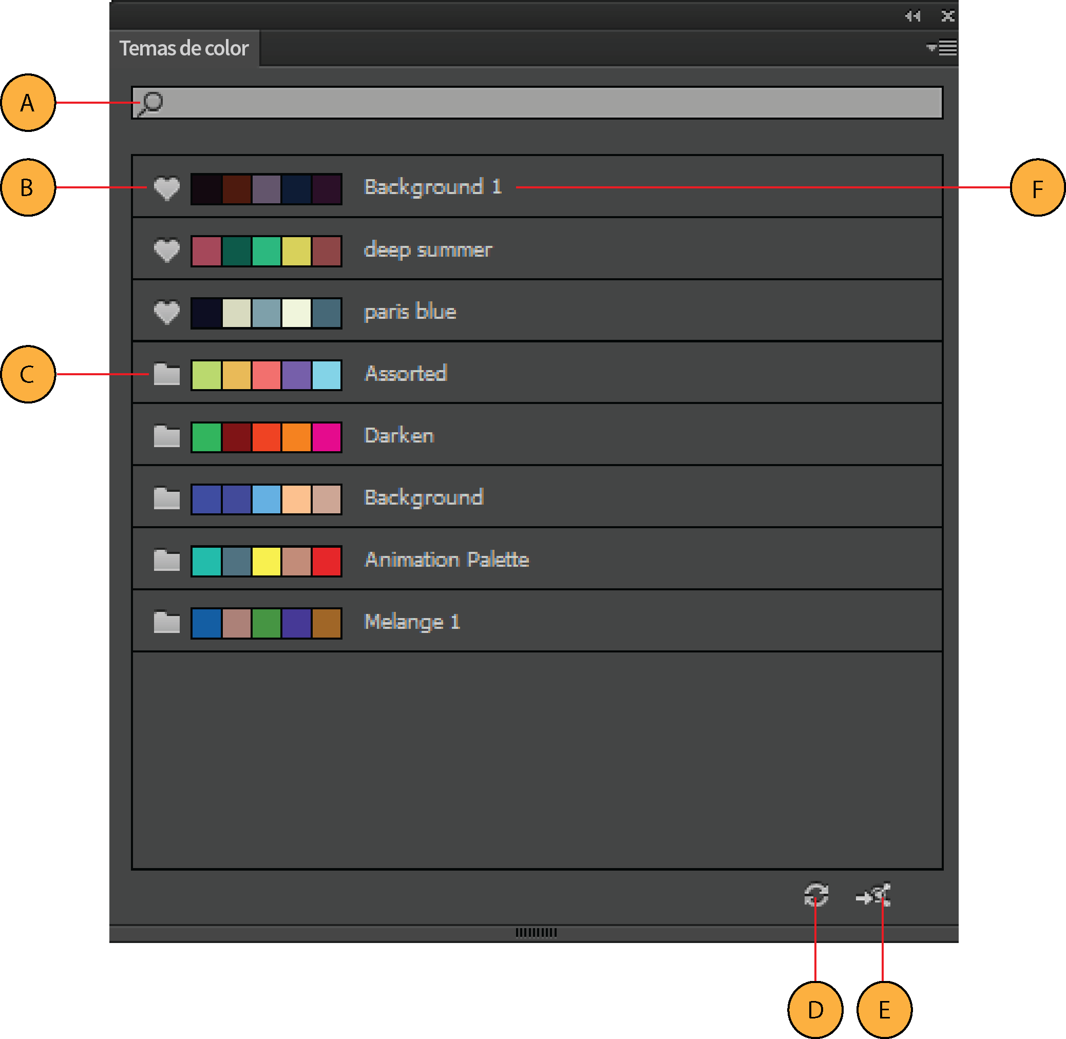 A. Búsqueda de tema por nombre B. Icono de tema favorito C. Icono de carpeta de temas D. Actualizar E. Iniciar el sitio web de Color F. Nombre del tema