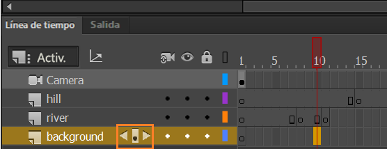 Puede desplazarse entre los fotogramas clave de la capa activa mediante los controles izquierdo y derecho de la capa. Asimismo, también puede utilizar el menú y los métodos abreviados de teclado.