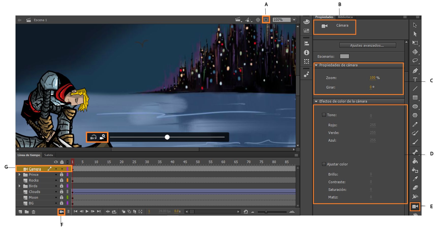 . Junto a la vista de la cámara y del escenario, podrá ver el contenido dentro de los límites de la cámara.