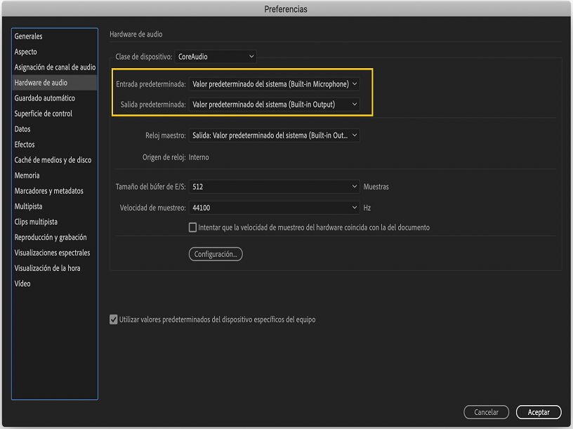 1. Elija Editar > Preferencias > Hardware de audio (Windows) o Adobe > Preferencias > Hardware de audio (Mac OS).
