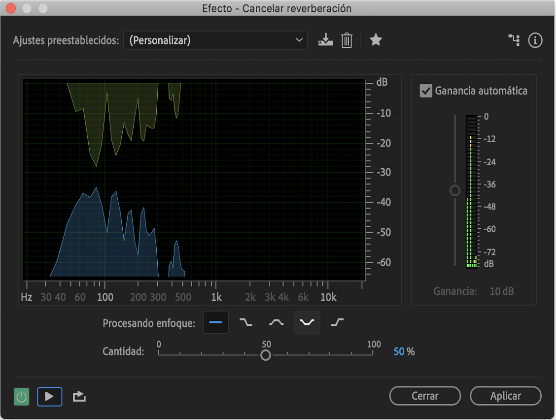 El efecto Reducción de ruido / Restauración > DeReverb calcula el perfil de reverberación y ayuda a ajustar la cantidad de reverberación. Los valores van del 0 % al 100 % y controlan la cantidad de procesamiento aplicado a la señal de audio.