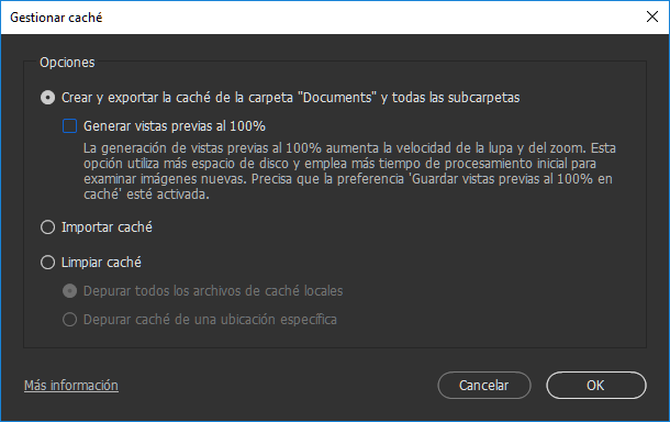 - Seleccione Generar vistas previas al 100% para crear la vista previa completa de imágenes en la caché. Esta opción está desactivada por defecto.