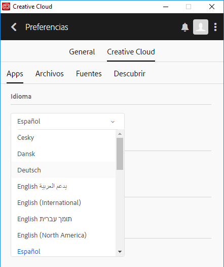 Puede cambiar el idioma predeterminado para las futuras instalaciones de sus aplicaciones de Creative Cloud. Debe reinstalar las aplicaciones existentes para beneficiarse de este cambio.