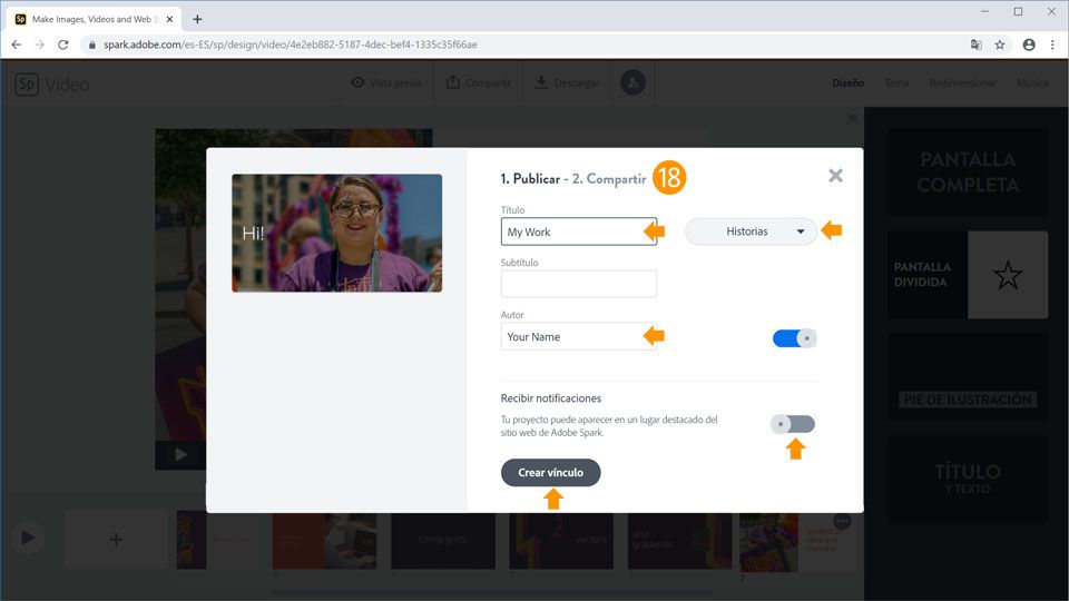18. Haz clic en el botón Compartir en el menú superior, escoge una categoría, piensa en un título e introduce tu nombre en el campo Autor. Desactive la opción Recibir notificaciones (o mantenla activada si estás publicando tu propia historia). Por último, haz clic en el botón Crear vínculo para publicar tu vídeo. Ahora ya puedes copiar y compartir el vínculo público de tu vídeo o elegir una de las otras opciones para compartir.