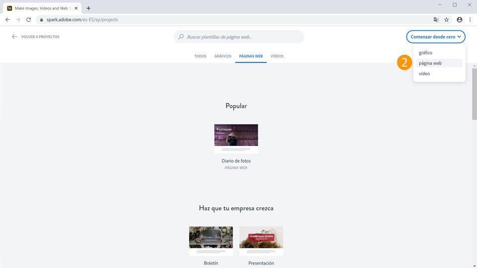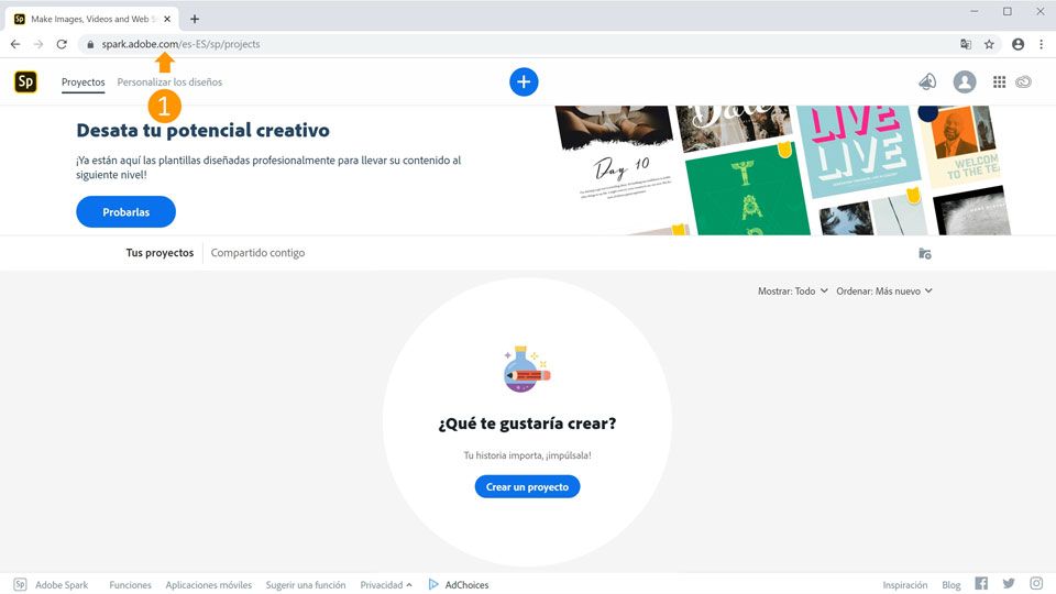 1. Abre Adobe Spark en un navegador web de escritorio (http://spark.adobe.com). Haz clic en el botón Crear un proyecto.
