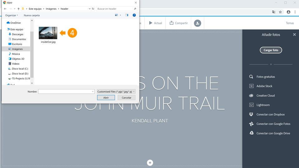 4. Añade la imagen de cabecera: haz clic en el icono + debajo del subtítulo. Haz clic en Foto y después en Cargar foto. Consulta los archivos que descargaste para este tutorial y elige insideOut.jpg.