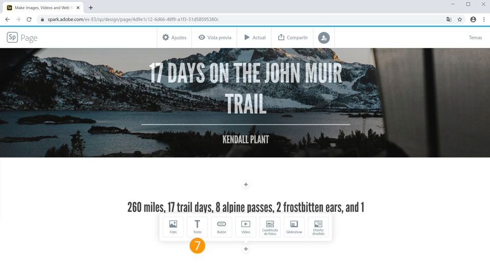 6. Añade el texto del encabezado: Haz clic en el icono + debajo de la imagen de cabecera y selecciona Texto. Escribe "260 miles, 17 trail days, 8 alpine passes, 2 frostbitten ears, and 1 camera". Haz clic dentro del texto y selecciona H2 para modificar el formato. Haz clic de nuevo en el texto y selecciona el icono Alineación al centro.