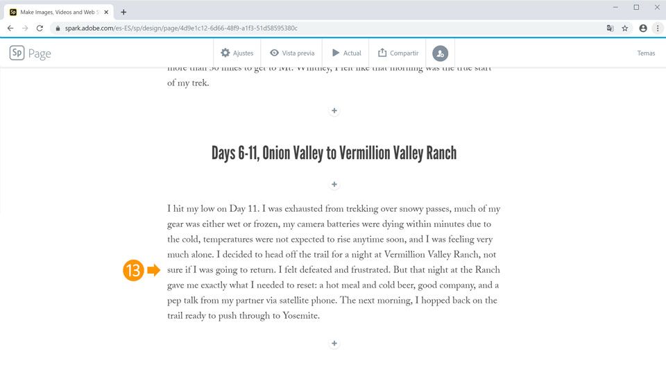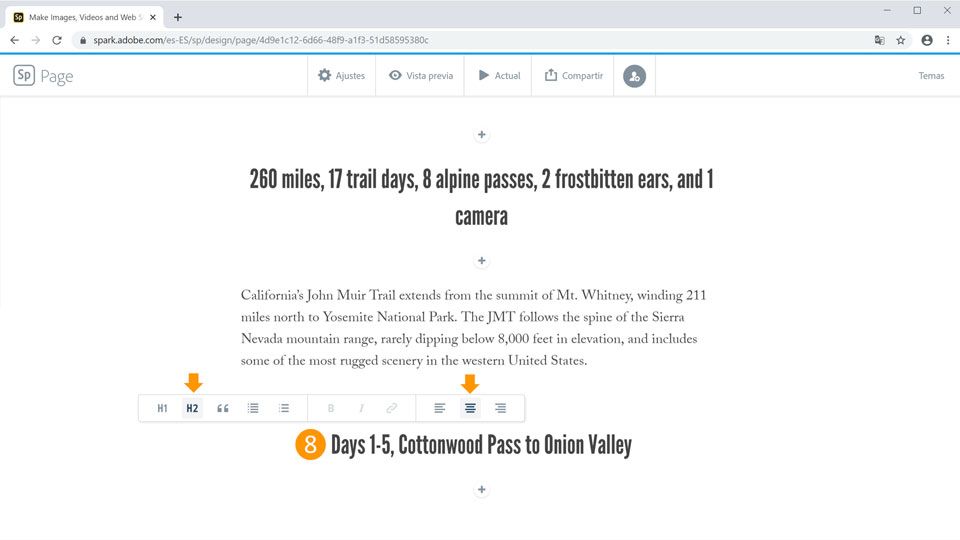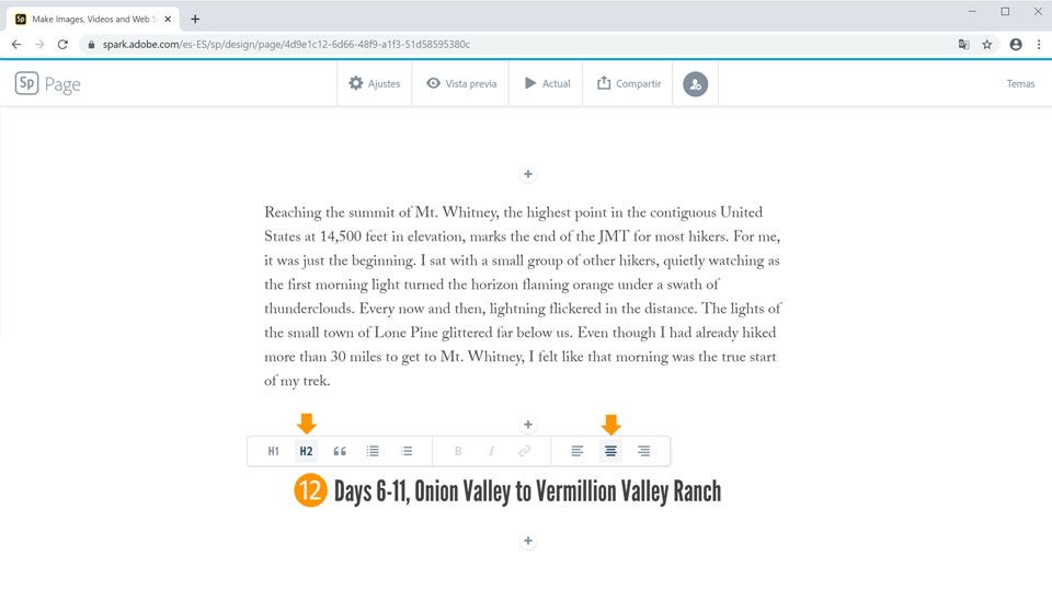 12. Añade el texto del encabezado: Haz clic en el icono + y después selecciona Texto. Escribe "Days 6-11, Onion Valley to Vermillion Valley Ranch", aplícale el formato H2 y alinéalo al centro.