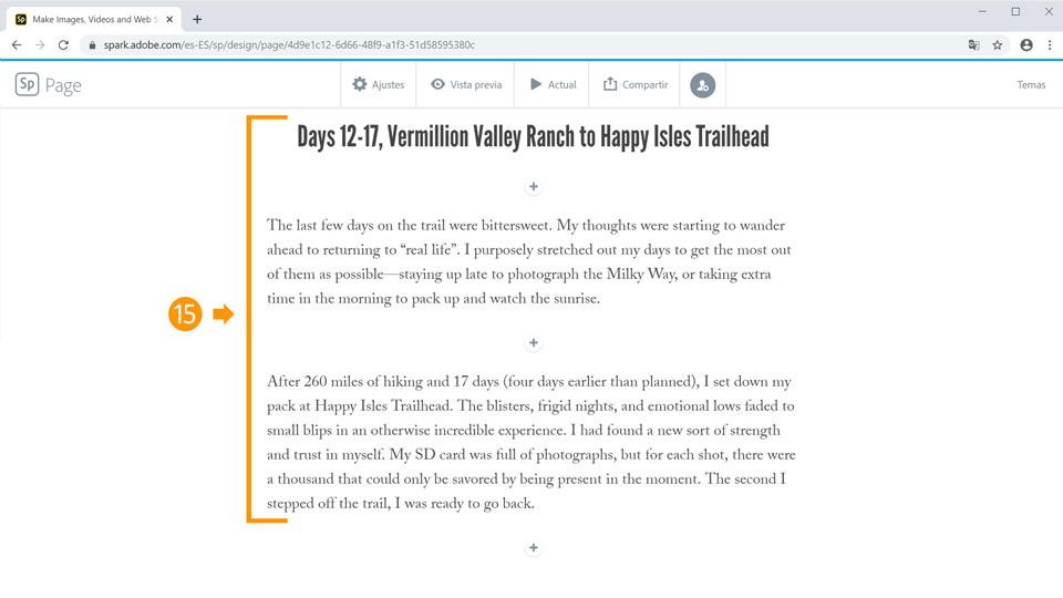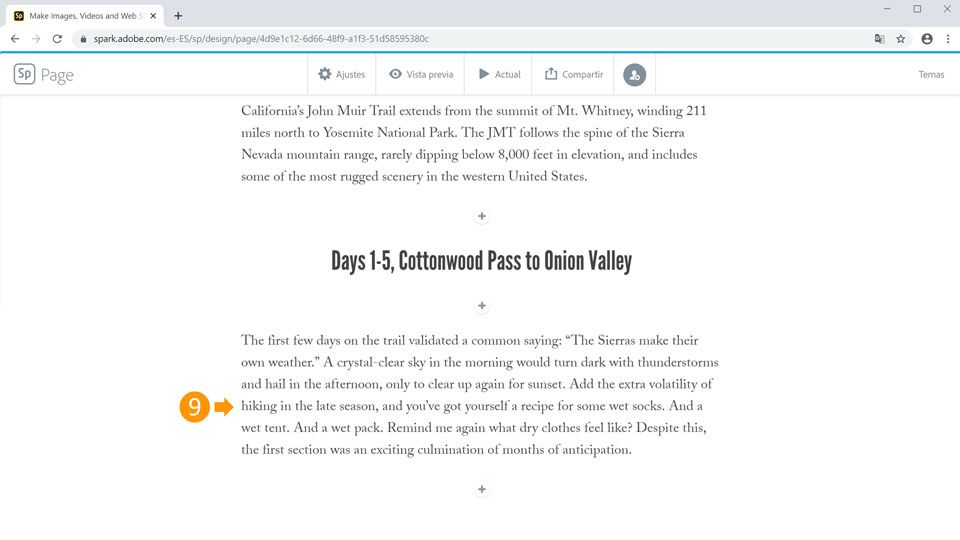 7. Añade el cuerpo del texto: Copia el primer párrafo del ejemplo que se ha proporcionado desde "California's John Muir Trail" hasta "…western United States". Haz clic en el icono + debajo del texto del encabezado, selecciona Texto y pega el texto que acabas de copiar.