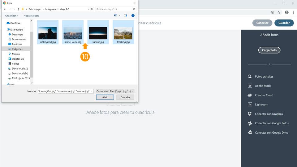 10. Añade una cuadrícula de fotos: Haz clic en el icono + debajo del último párrafo y selecciona Cuadrícula de fotos y Cargar foto. Elige las 4 fotos de la carpeta days 1-5 desde los archivos de práctica (Mayús + hacer clic para seleccionarlas todas). Haz clic en Abrir y después a Guardar una vez que las imágenes se hayan cargado.