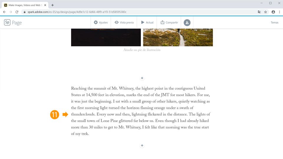 11. Añade el cuerpo del texto: Copia el tercer párrafo del ejemplo que se ha proporcionado desde "Reaching the summit" hasta "…start of my trek". Haz clic en el icono +, selecciona Tipo y pega el texto.