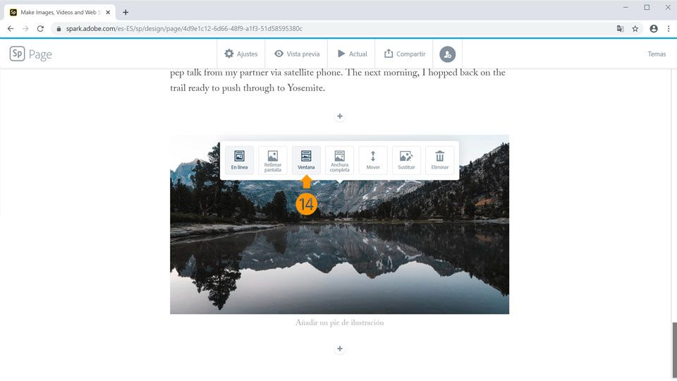 14. Añade una imagen de ventana: Haz clic en el icono +, selecciona Foto y después Cargar foto. Elige expanse.jpg de la carpeta days 6-11 desde los archivos de práctica. Haz clic en Abrir y después en Ventana desde las opciones de la foto. Desplázate hacia arriba y hacia abajo dentro de la imagen para ver la funcionalidad de la ventana.