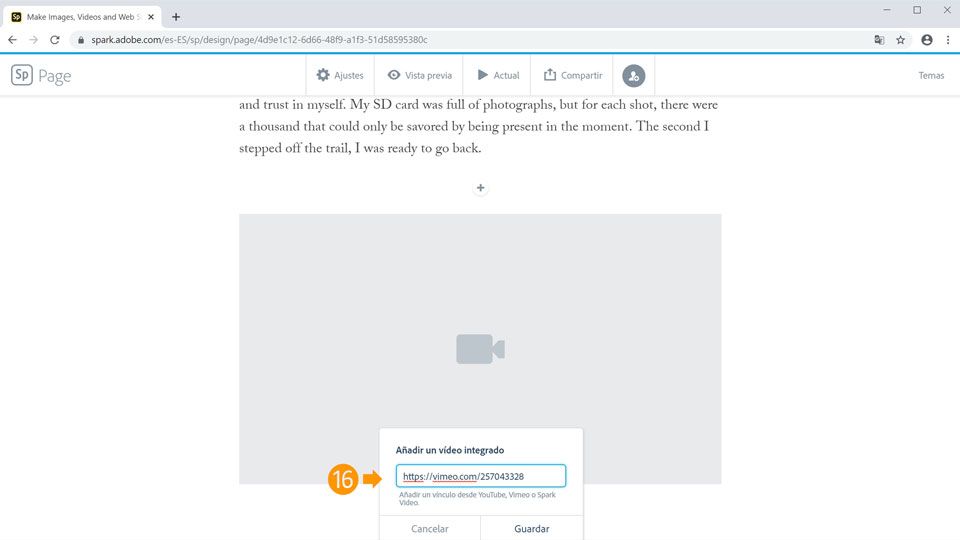 16. Añade un vídeo: Haz clic en el icono +, selecciona Vídeo y escribe "https://vimeo.com/257043328" en el campo Añadir un vídeo integrado. Haz clic en Guardar.