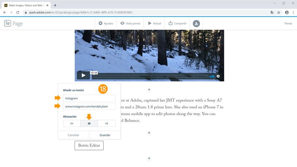 18. Añade un botón: Haz clic en el icono + debajo del último párrafo y selecciona Botón. Escribe "Instagram" en el primer campo y "https://www.instagram.com/kendall.plant/" en el siguiente. Alinéalo al centro y después haz clic en Guardar.