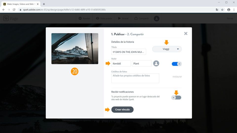 20. Comparte: Haz clic en Compartir en la parte superior, elige una categoría, cambia el nombre de autor a "Kendall Plant" desactiva la opción Recibir notificaciones (o mantenla activada si estás publicando tu propia historia). Haz clic en Crear vínculo y después copia el vínculo o elige una de las opciones para compartir.