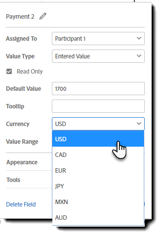 Los valores que figuran en las propiedades de campo de Acrobat vienen determinados por las monedas aceptadas en sus cuentas comerciales de Braintree.