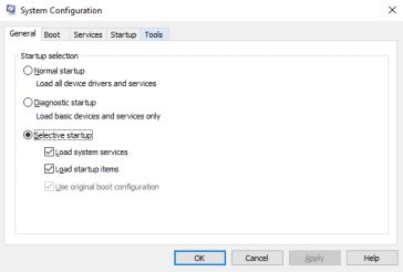 4. Bajo Inicio selectivo, desmarque la casilla de verificación Cargar elementos de inicio.