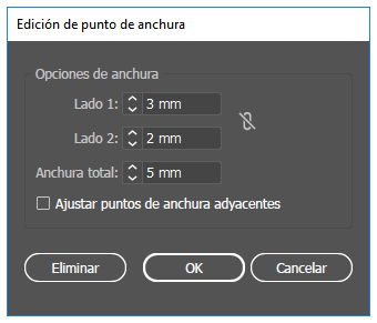 Para crear o modificar un punto de anchura mediante el cuadro de diálogo Edición de punto de anchura, haga doble clic en el trazo con la herramienta Anchura y edite los valores del punto de anchura. Si selecciona la casilla de verificación Ajustar puntos de anchura adyacentes, los cambios realizados en el punto de anchura seleccionado afectarán también a los puntos de anchura adyacentes.