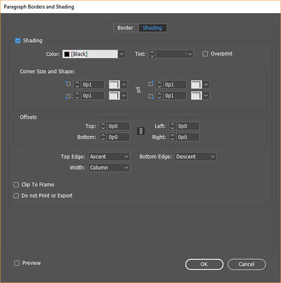 - En el menú del panel Párrafo (Ventana > Tipo y tablas > Párrafo), seleccione la opción Sombreado.
