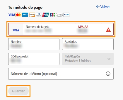 Si los datos de su tarjeta o la información de facturación han cambiado, puede actualizarlos. Adobe probará su pago con la nueva información.
