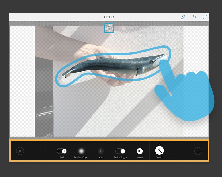 The edges of the cutout are refined automatically, but you can experiment with other Cut Out options to make further edits. To undo and redo an operation, tap the curved arrow in the top menu. Tap the checkmark when you're happy with the cutout. Finally, drag the whale to position it in the scene.