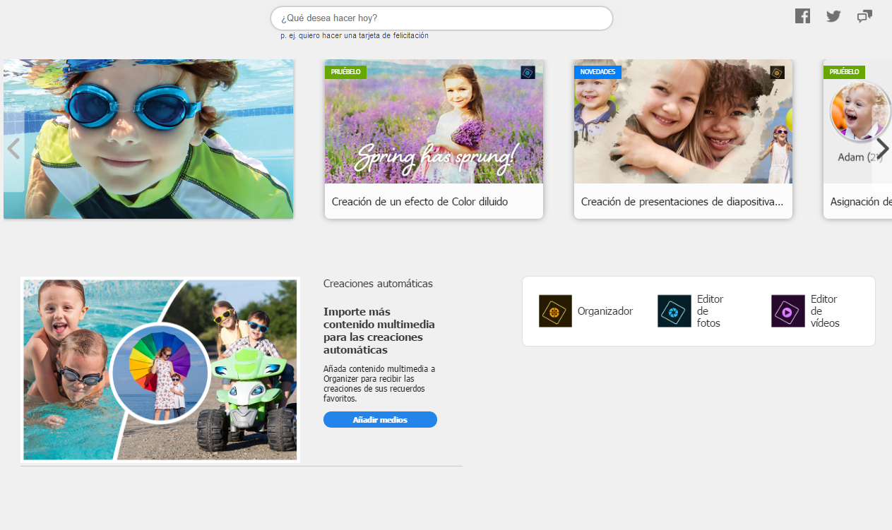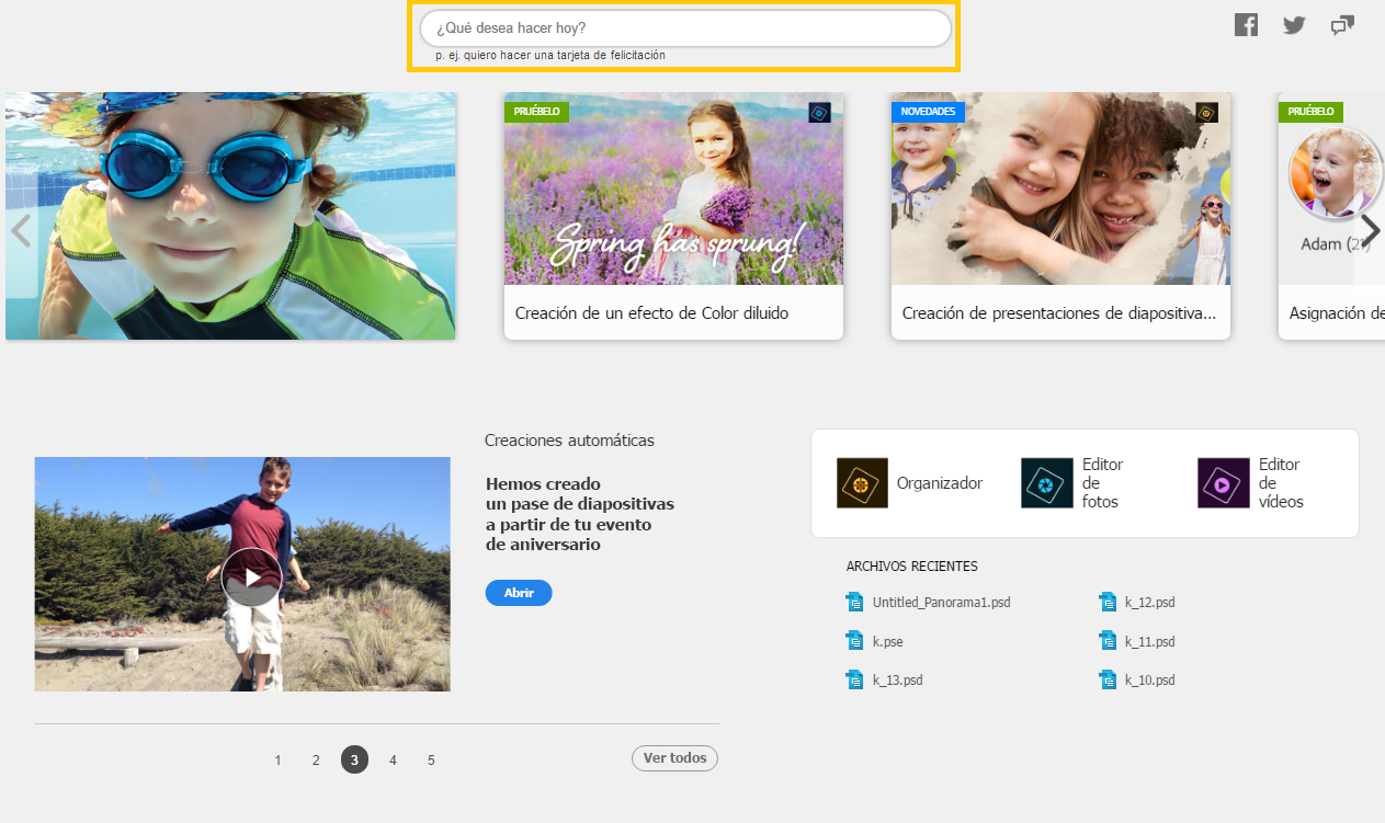 Acceda a los recursos de ayuda para obtener funciones, personalizar y compartir creaciones diseñadas automáticamente, y probar nuevos flujos de trabajo, entre otras muchas acciones, desde la pantalla de Inicio de Adobe Photoshop Elements.