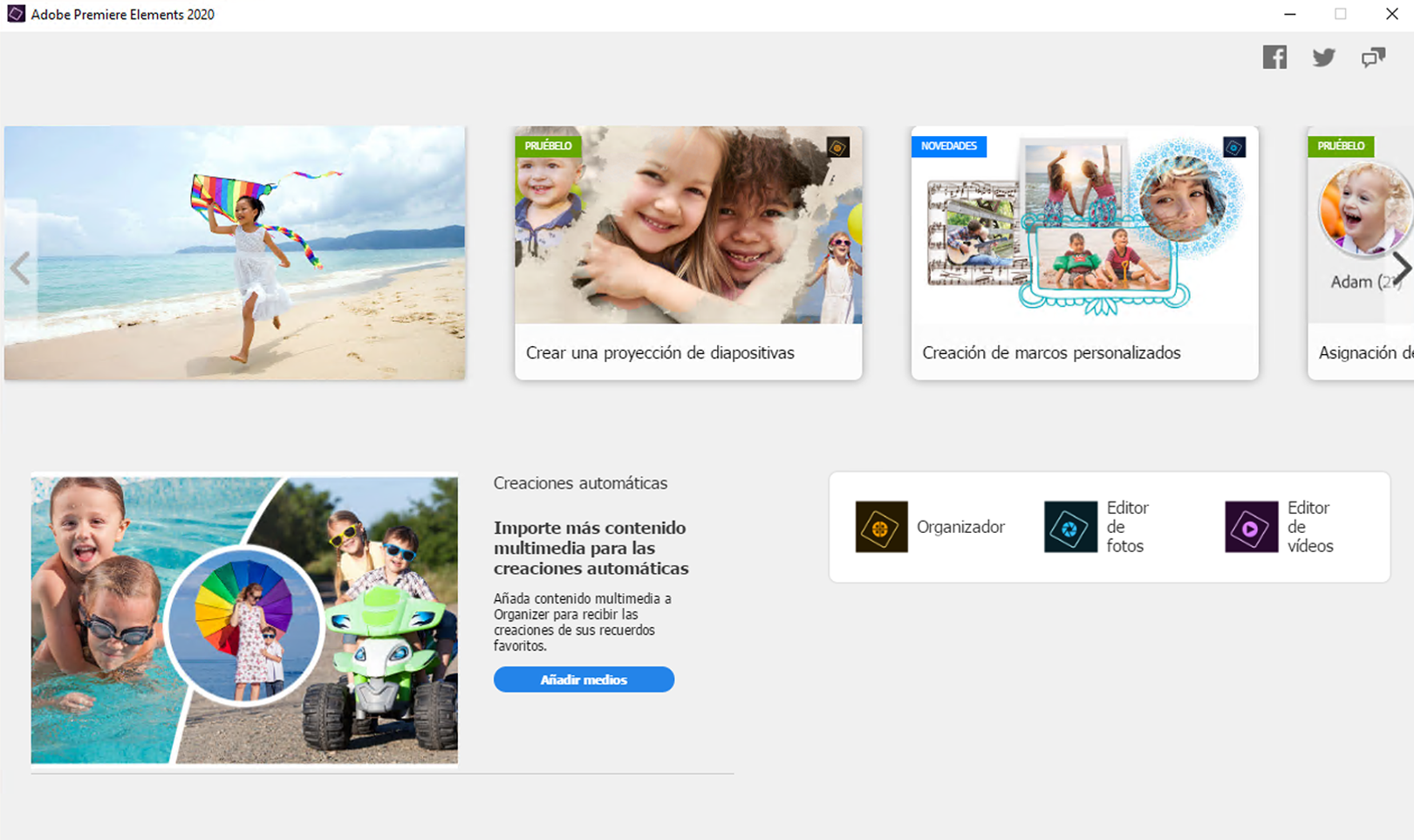 Empiece a utilizar los collages y las presentaciones de diapositivas de fotos y vídeos que se crean automáticamente para usted y se envían al inicio. Vea las novedades que hay respecto a la última versión, descubra cosas divertidas que puede probar y obtenga ideas, ayuda y tutoriales en la nueva pantalla de inicio. Monte películas fácilmente en el modo de edición rápida, totalmente rediseñado con una línea de tiempo simplificada que pone a su alcance todo lo que necesita. Además, obtenga dos nuevas ediciones guiadas para la creación de efectos de panel de cristal y transiciones de desvanecimiento de luminancia. Disfrute también de un rendimiento más rápido en todo Premiere Elements.
