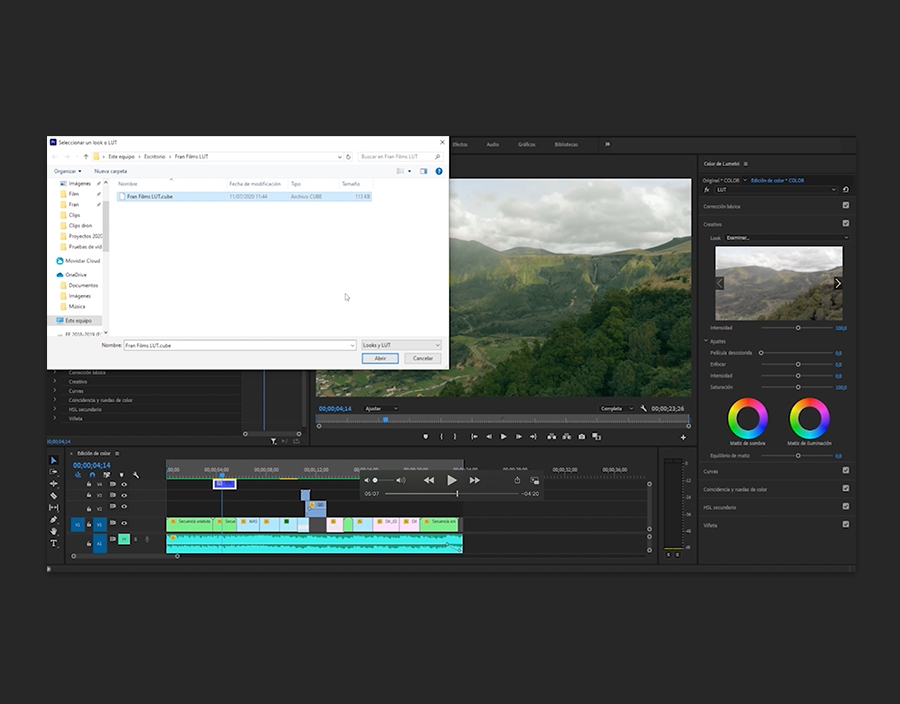 Como seguramente ya sabes, una LUT es una tabla de búsqueda de color predefinida que puedes usar para tus secuencias. @fran_films te ofrece su propia LUT para que te la descargues y la uses en tus vídeos de forma gratuita. Para añadir esta LUT o elegir otra, vuelve al panel Lumetri Color y, una vez en Creativo, haz clic en el menú desplegable Aspecto. Dirígete al Navegador para seleccionar la LUT de Fran de tus descargas o bien experimenta con el resto de opciones disponibles.