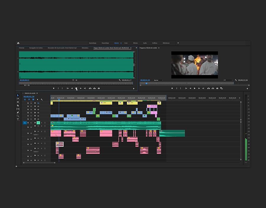 TAl añadir efectos de sonido, el factor más importante a tener en cuenta es que sean realistas. Dicho de otra manera: el sonido tiene que encajar con lo que se está viendo. El audio de la cámara es la fuente evidente del sonido, pero si este se contamina debido al ruido de fondo o si su nivel es demasiado bajo, también podrás crear tus propios efectos de sonido y añadirlos a Premiere Pro. Cuando el sonido obtenido te satisfaga, solo tendrás que importarlo y arrastrarlo hasta la Línea de tiempo. A continuación, podrás moverlo hasta el punto temporal exacto en el que quieras que empiece y usar la herramienta Cuchilla para recortarlo según tus necesidades.